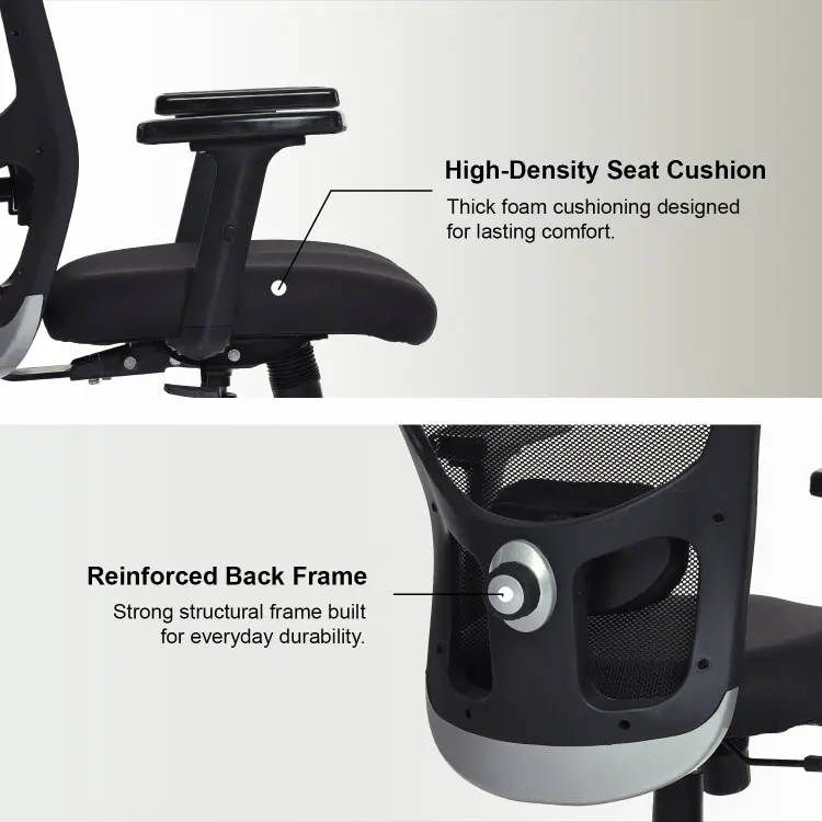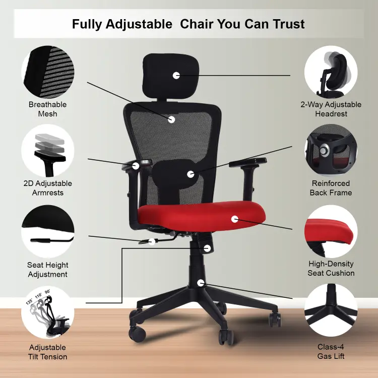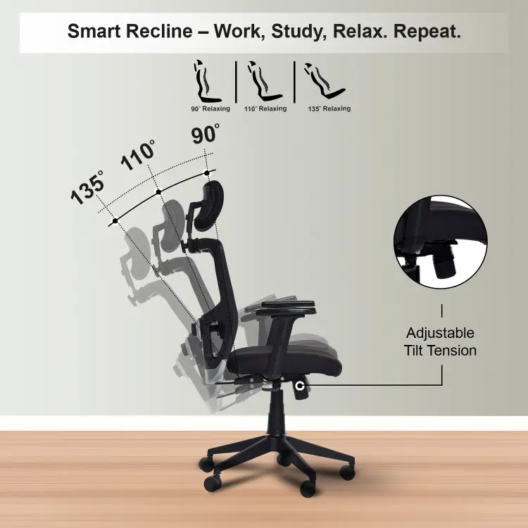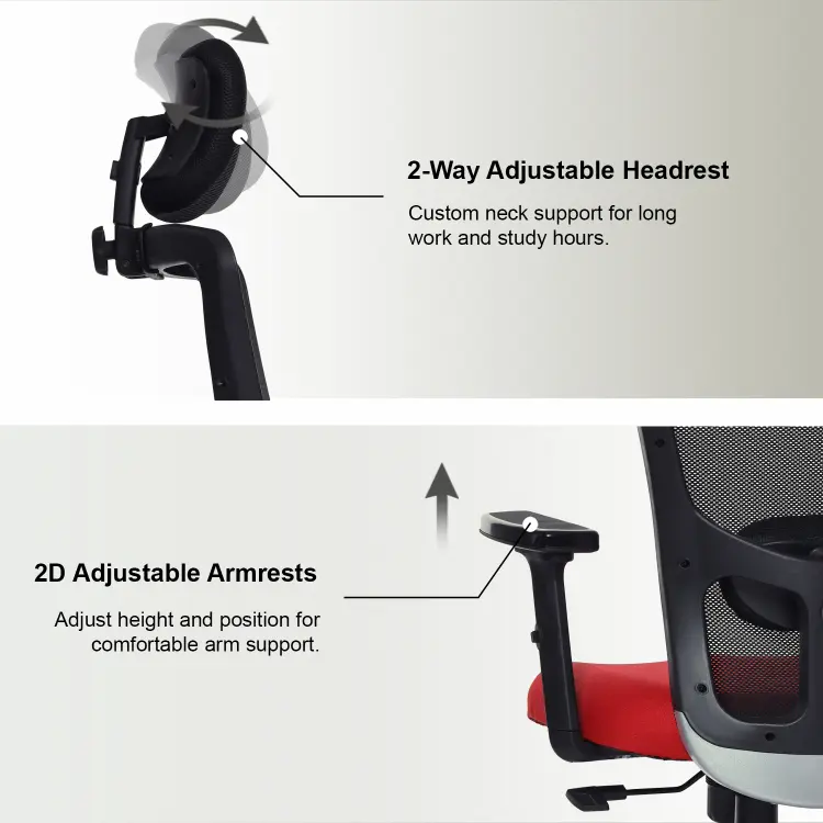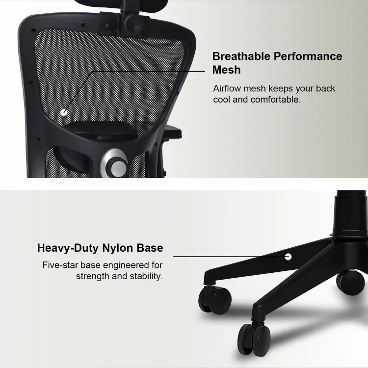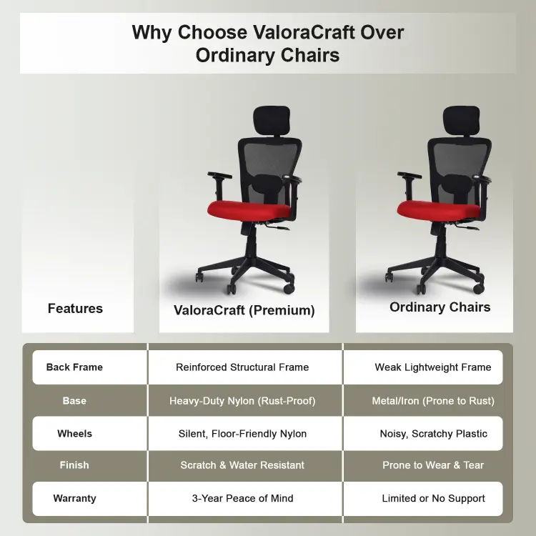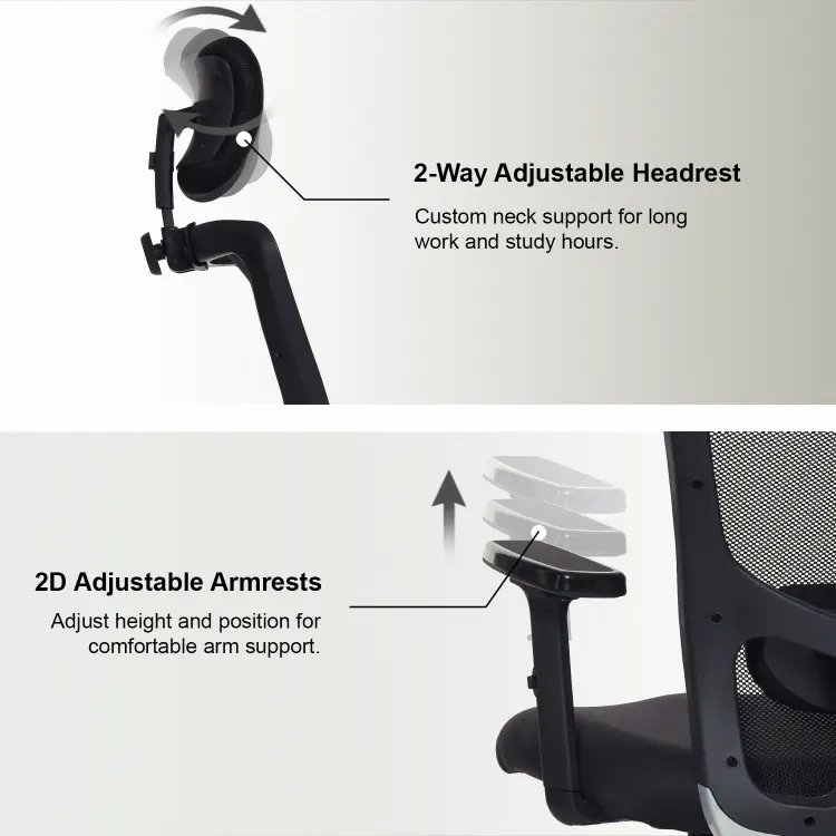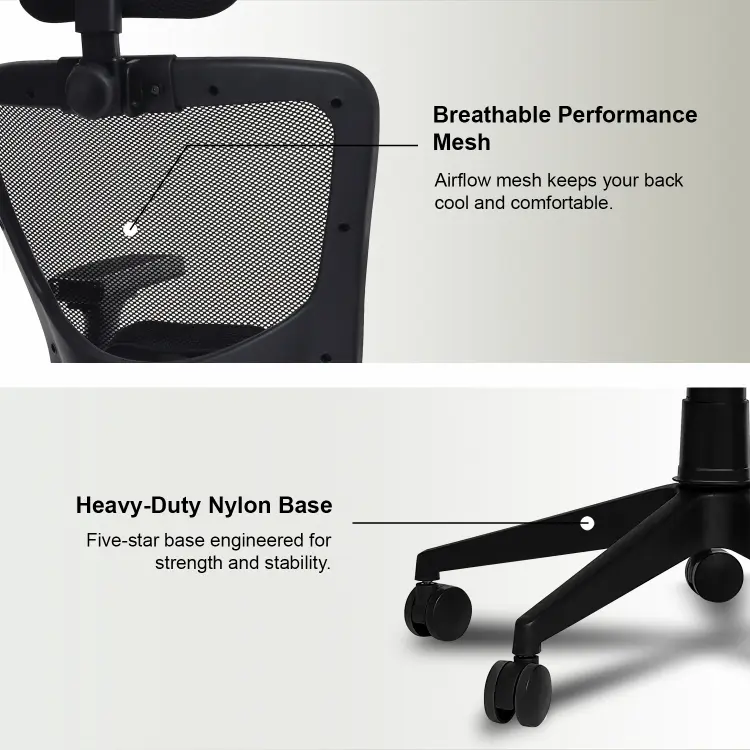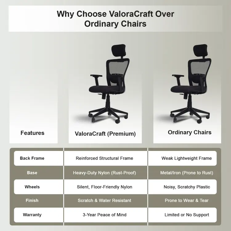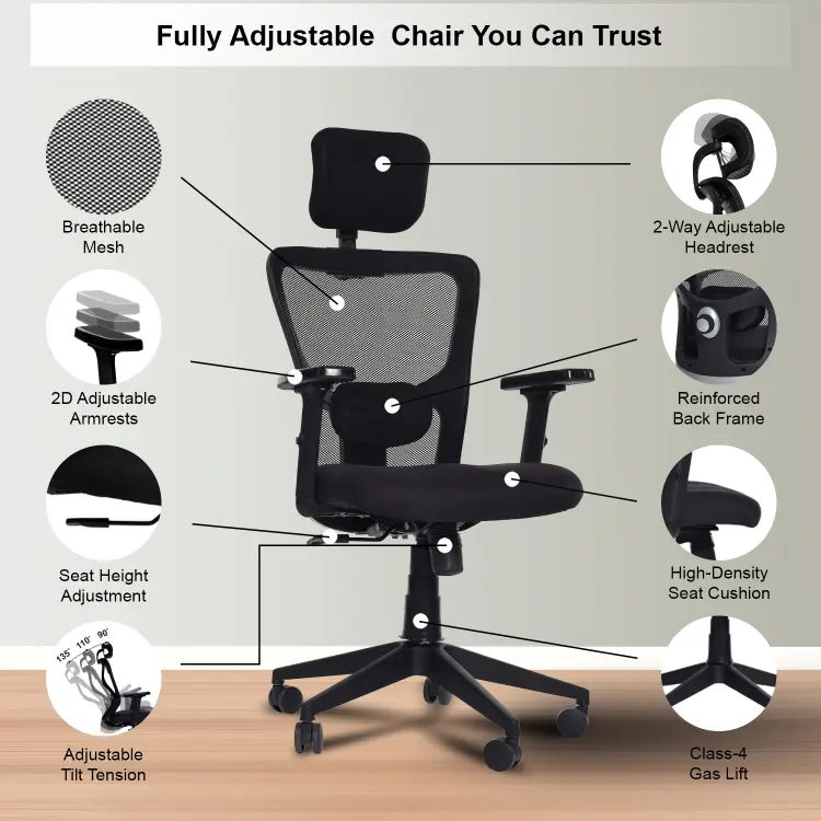 The Valora Craft Apex Ergonomic High-Back Office Chair is designed for long hours of productivity and comfort. This ergonomic office chair features a breathable mesh back, adjustable headrest, and 2D armrests for proper posture support. With a smooth tilt mechanism, hydraulic height adjustment, and durable construction, this comfortable office chair works perfectly as a desk chair, study chair, or computer chair for home and office setups.
