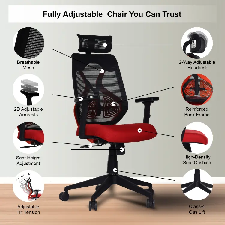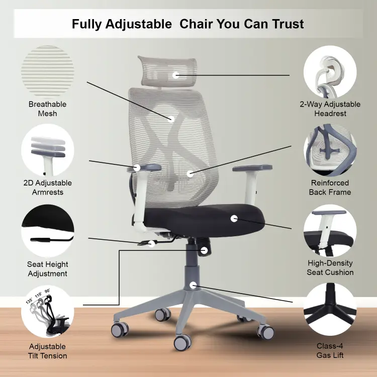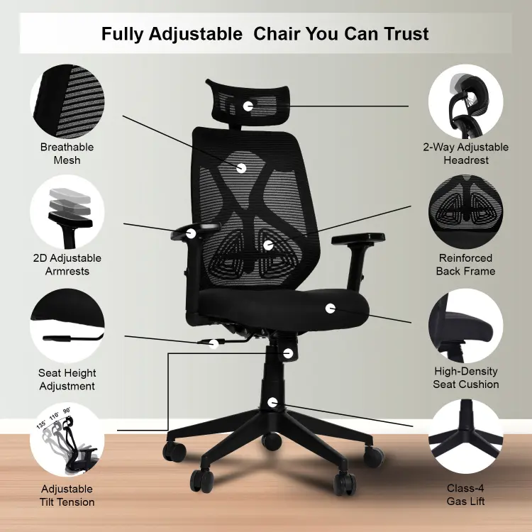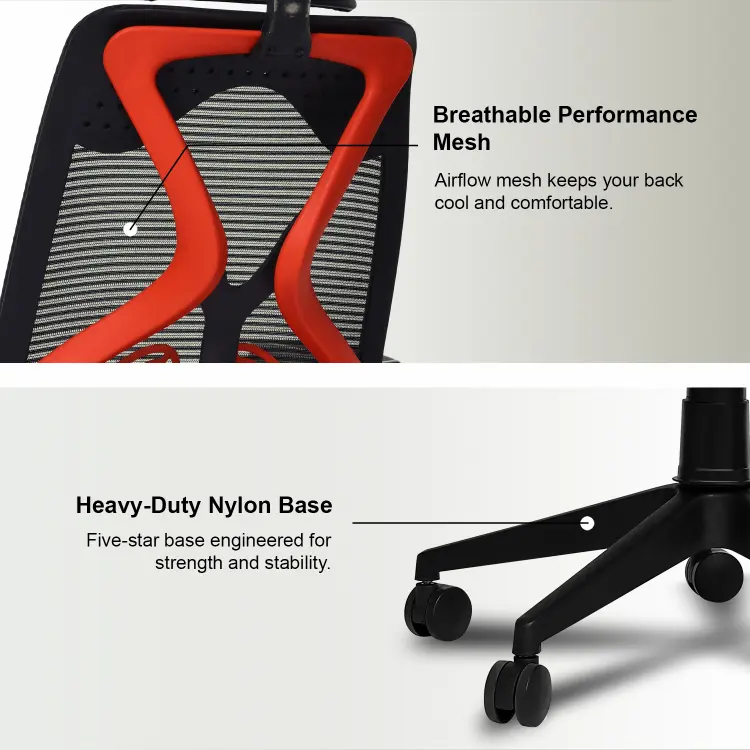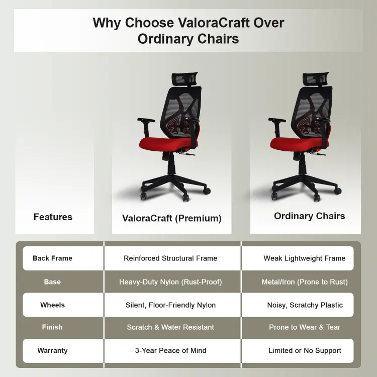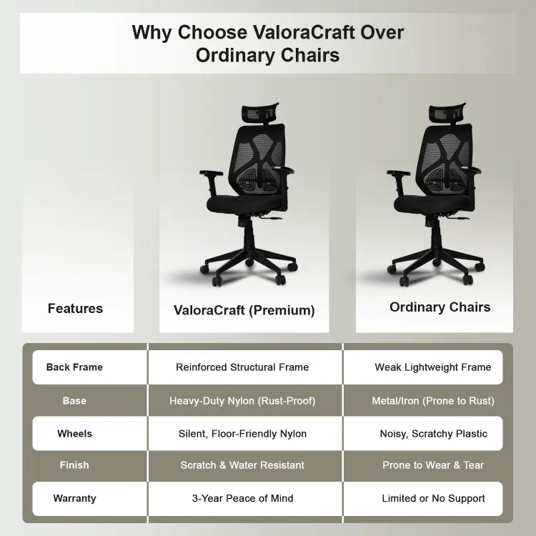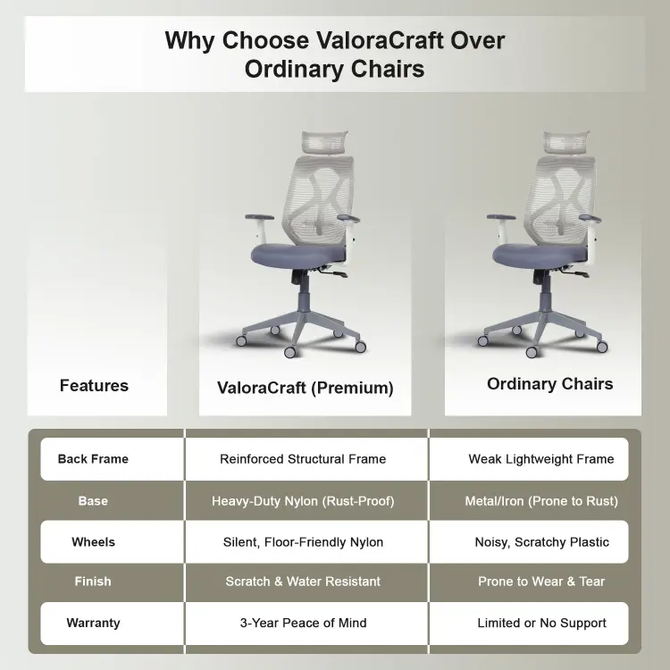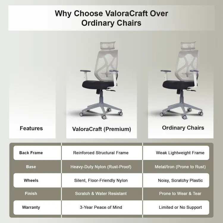 The Valora Craft Bolt ergonomic office chair combines breathable mesh, adjustable headrest and lumbar support, a Class-4 gas lift, and smooth 360° swivel movement. Built with a reinforced frame and durable metal base, this comfortable office chair delivers reliable support and stability for long study sessions, office work, or gaming.